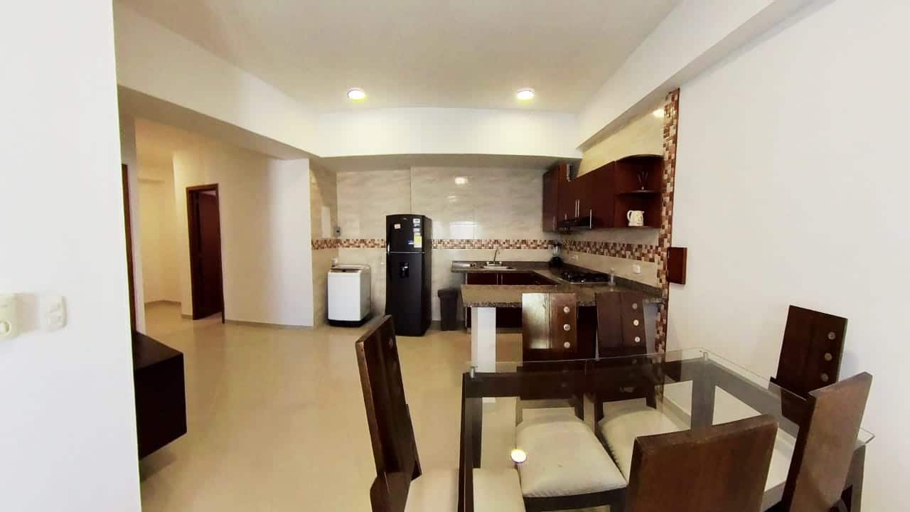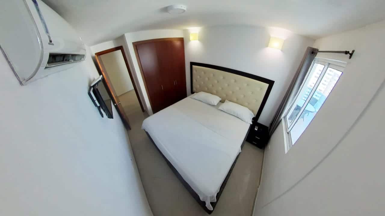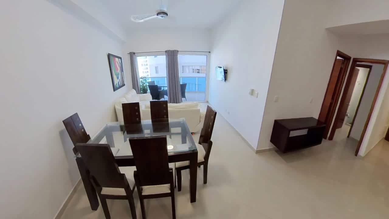 Confortable apartamento con balcón y hermosa vista al mar, sala, comedor, cocina abierta, dos habitaciones, la principal con baño interno, un segundo baño, parqueadero incluido en el precio. Incluye aires acondicionados.