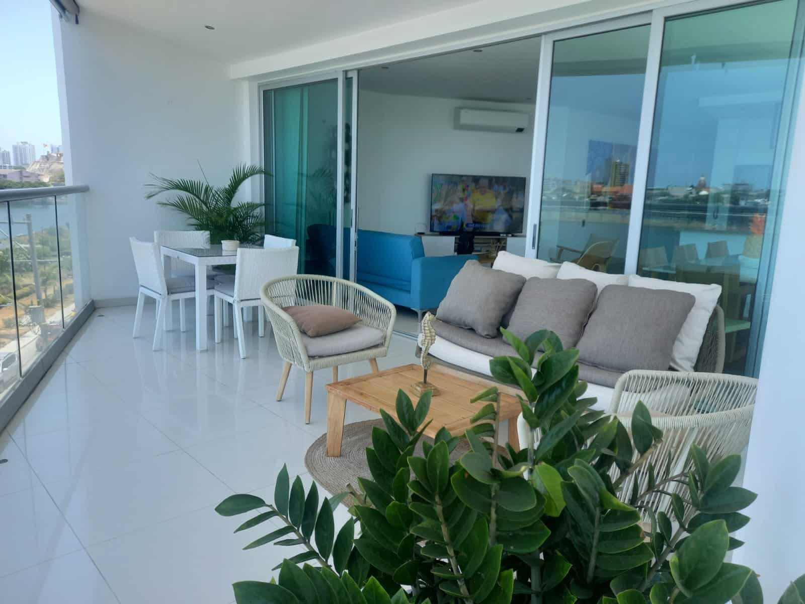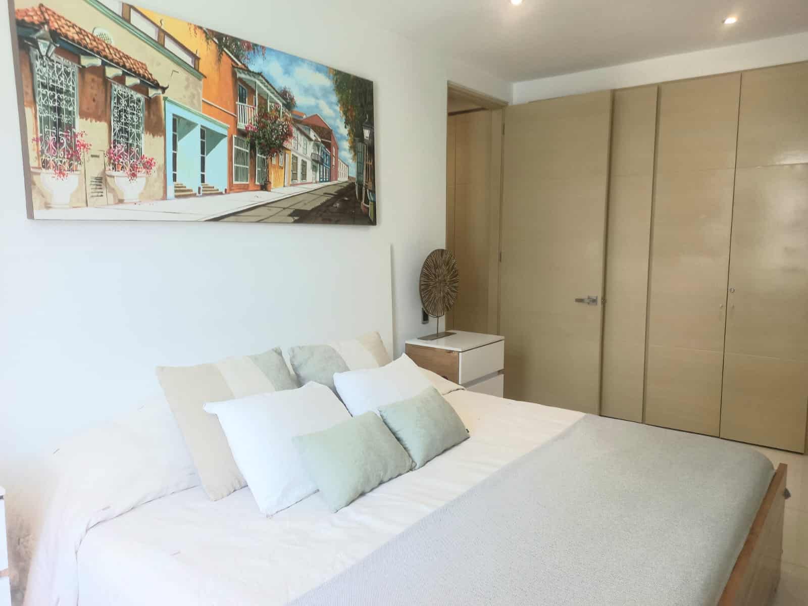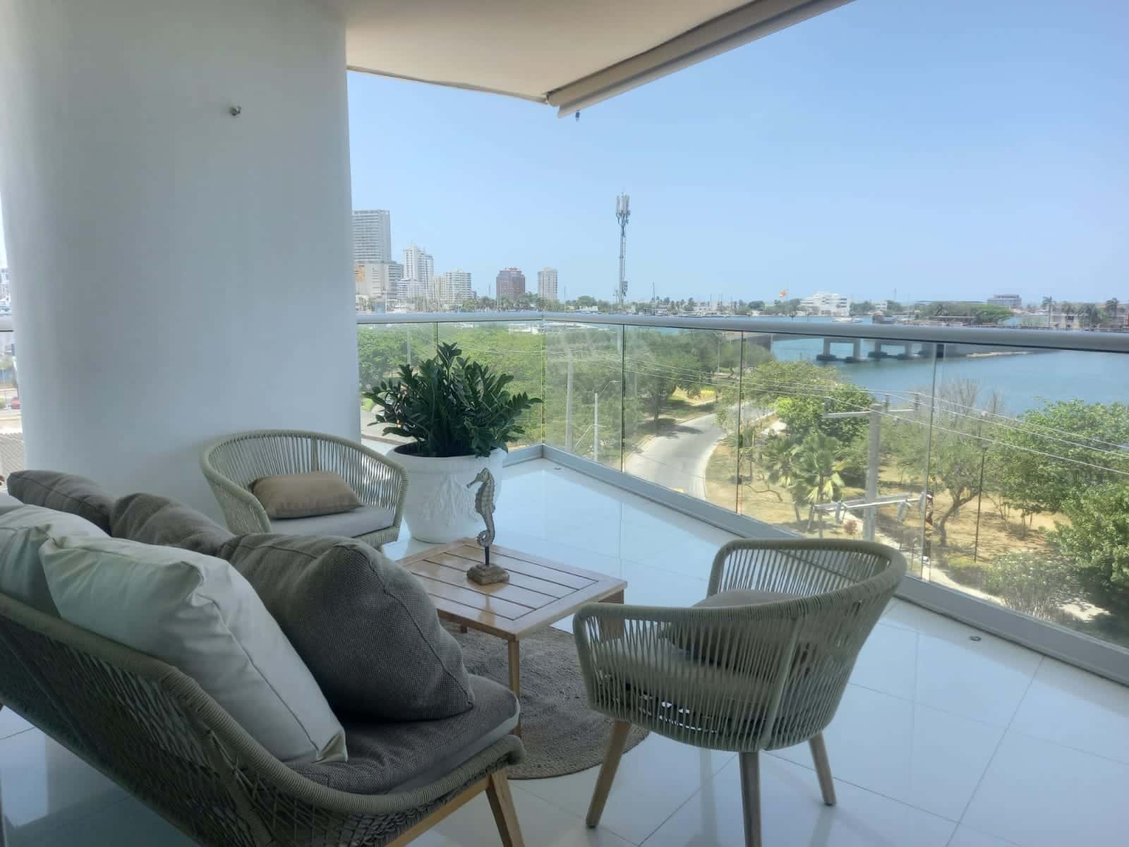 Disfrute desde su balcón los hermosos atardeceres de Cartagena y una excepcional vista a la Bahia de Manga. A solo 3 minutos del Centro histórico y con una imponente vista tanto al sector amurallado como a la bahia de Cartagena este apartamento, cómodo, confortable, ofrece amplio balcón, sala comedor, cocina abierta, cuarto y baño de servicio, área de labores , baño social . Tres alcobas, la principal de gran tamaño, con baño interno,cuenta con closet grande. La segunda y tercera habitación, comparten un baño completo que les permite ingreso desde su interior. El apartamento cuenta con parqueadero para un vehículo y un segundo espacio, de menor tamaño, para motos y bicicletas, adicional cuenta con depósito. El costo del apartamento incluye aires acondicionado en las habitaciones y sala, cortinas y black outs.