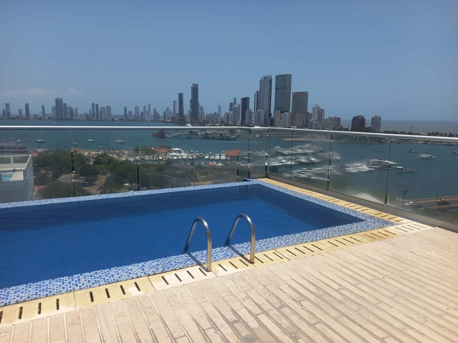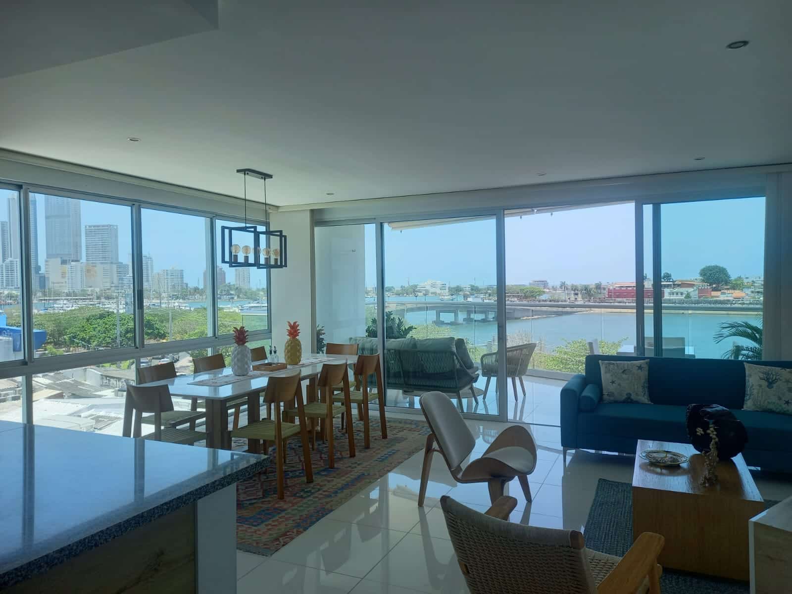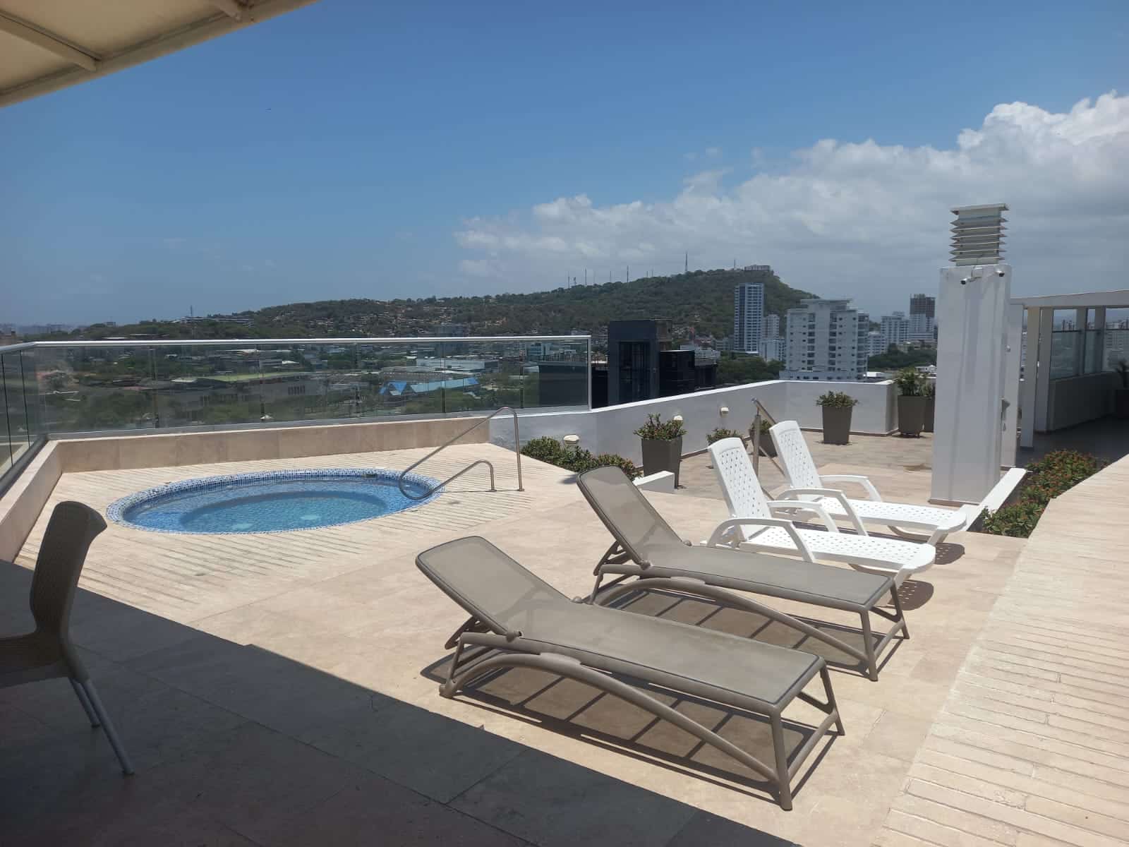 Disfrute desde su balcón los hermosos atardeceres de Cartagena y una excepcional vista a la Bahia de Manga. A solo 3 minutos del Centro histórico y con una imponente vista tanto al sector amurallado como a la bahia de Cartagena este apartamento, cómodo, confortable, ofrece amplio balcón, sala comedor, cocina abierta, cuarto y baño de servicio, área de labores , baño social . Tres alcobas, la principal de gran tamaño, con baño interno,cuenta con closet grande. La segunda y tercera habitación, comparten un baño completo que les permite ingreso desde su interior. El apartamento cuenta con parqueadero para un vehículo y un segundo espacio, de menor tamaño, para motos y bicicletas, adicional cuenta con depósito. El costo del apartamento incluye aires acondicionado en las habitaciones y sala, cortinas y black outs.